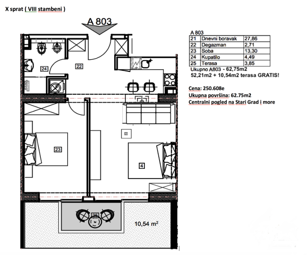Квартира в новостройке Черногории включает гостиную, совмещенную с кухней, - 21,98 кв. м, спальню - 10,46 кв. м, гардеробную - 2,47 кв. м, совмещенный санузел - 4,59 кв. м, террасу - 3,6 кв. м. Восьмой этаж в комплексе соответствует высоте десятого этажа.