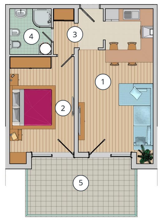 Квартира в Будве состоит из гостиной-кухни - 21,80 кв. м, спальни- 14,51кв. м, санузла - 4,0 кв. м, террасы - 13,68 кв. м. Владельцы апартаментов обеспечены машино-местами.