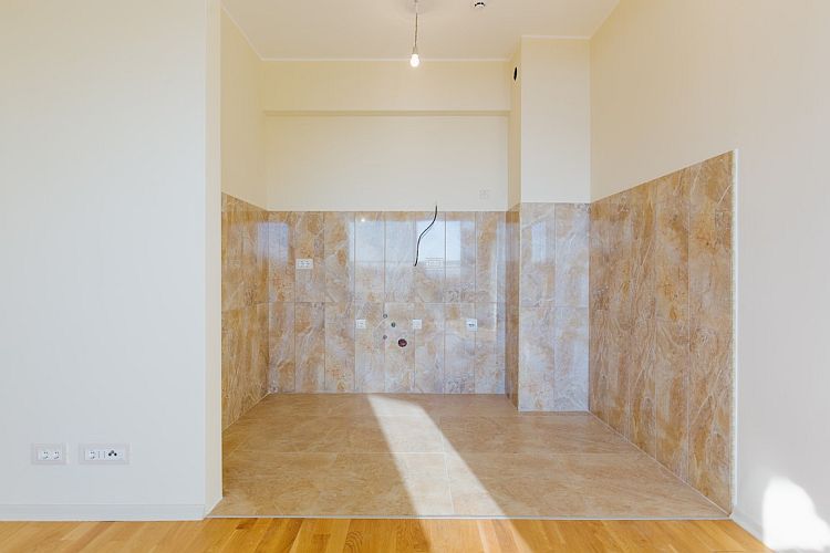 Квартира (E502) в Будве находится на 5-м этаже и включает гостиную, совмещенную с кухней, - 20,43 кв. м, спальню - 12,55 кв. м, санузел - 3,35 кв. м, террасу - 10,23 кв. м.