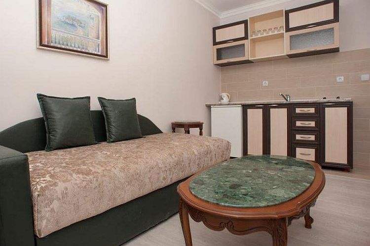 В каждой студии также есть выход на большой балкон площадью 7 кв.м с прекрасным видом на море. Возможно размещение трех человек.