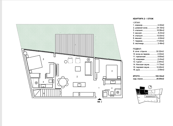 Верхний уровень квартиры в Тивате состоит из коридора - 3,30 кв.м, гостиной, совмещенной с кухней и столовой - 34,18 кв.м, двух спален - 10,59 кв.м и 13,83 кв.м, двух санузлов - 5,24 кв.м и 4,83 кв.м, террасы - 17 кв.м и собственного сада - 48,59 кв.м. Нижний уровень состоит: зоны отдыха - 32,22 кв.м, прачечной - 5,60 кв.м, кладовой - 2,43 кв.м, туалета - 2,43 кв.м, финской сауны - 11,70 кв.м, душа - 2,55 кв.м.