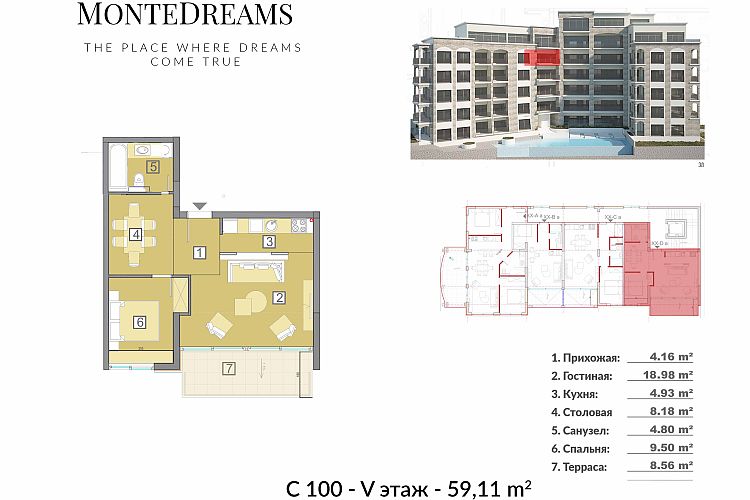 Квартира в Бечичи включает: прихожую - 4,16 кв.м, гостиную - 18,98 кв.м, кухню - 4,93 кв.м, столовую - 8,18 кв.м, спальню - 9,50 кв.м, санузел - 4,80 кв.м, террасу с видом на море - 8,56 кв.м.