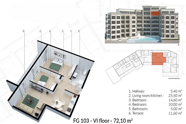 Квартира с отличным видом на море на шестом этаже в новом комплексе. На его территории - два бассейна, спа- и фитнес-центр, детский клуб, кафе, парковка. До моря - 600 м. В квартире - гостиная с обеденной зоной и кухней, две спальни, санузел и балкон.