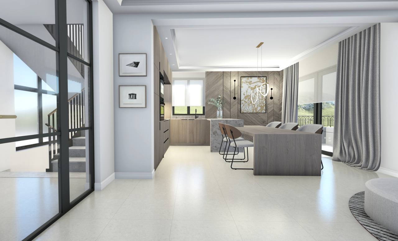 Первый этаж 105 кв.м: гостиная, кухня с обеденной зоной, санузел, спальня, тренажерный зал, прачечная, техническое помещение.